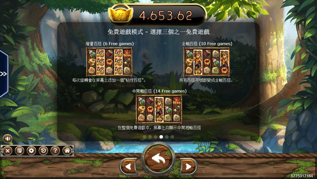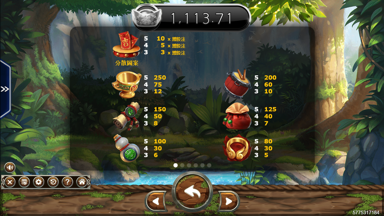 除分散圖案之外,遊戲中的百搭圖案可代替所有其他圖案;滾軸上出現三個或者更多分散圖案時,觸發免費遊戲模式;寶相僅出現在第五捲軸上,最多可獲得1000個積分。