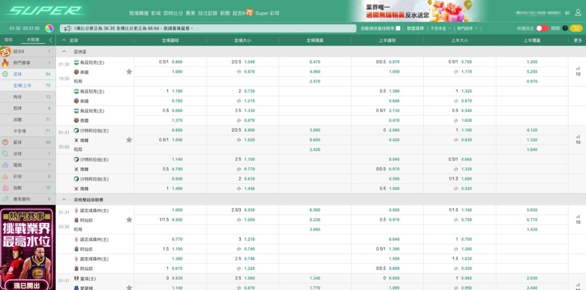 歐博百家樂娛樂城與Super體育合作,提供玩家刺激豐富的體育競猜之旅,籃球、足球、冰球、電競、彩球、指數、賽馬賽狗一應俱全。