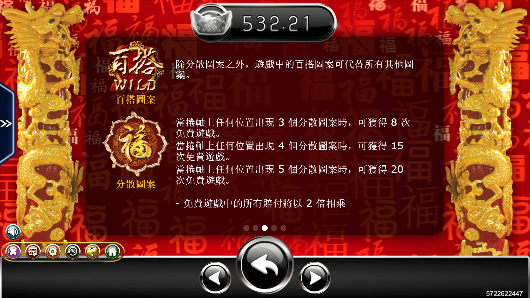 *獎金方式:連線交叉獎勵、相同圖示消除、全場倍數加總相乘、免費旋轉